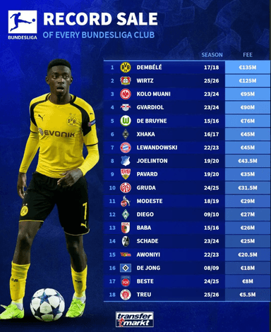 Most Expensive Outgoing Transfers in Bundesliga History: Dembélé Tops with €135m, Wirtz Second